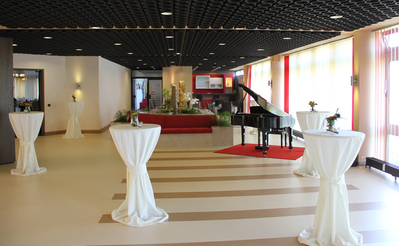 Unser Foyer kann mit Stehtischen und einem Buffet ausgestattet werden.